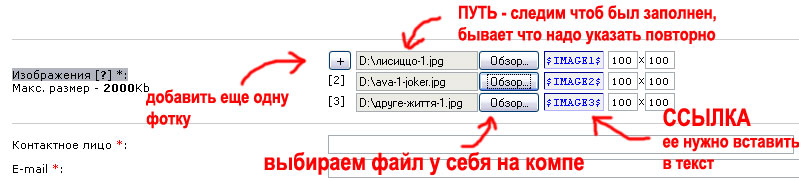 3. "Изображения [?] *:" - тут нам надо загрузить картинки ; )1) нажимаем "ОБЗОР" и указываем файл на своем компе;